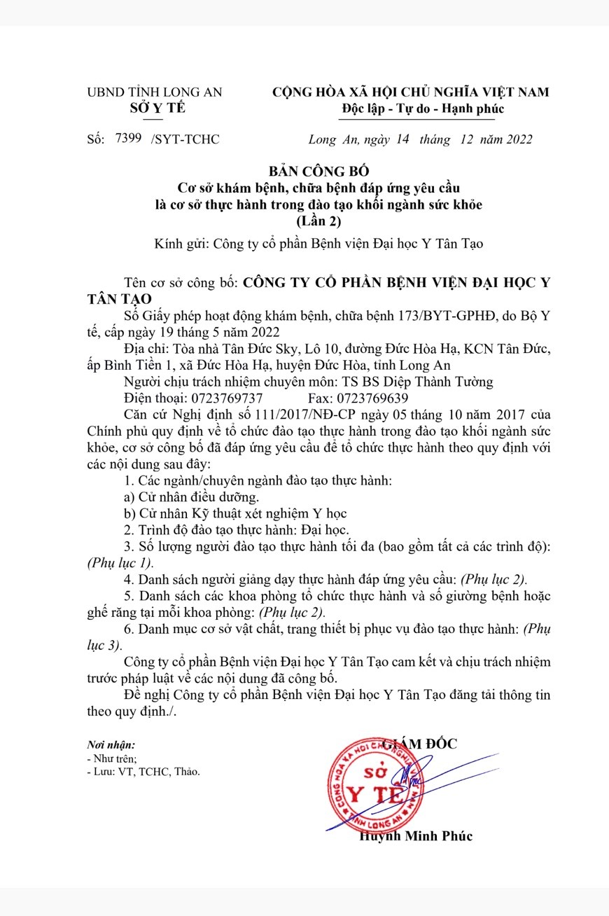 Căn cứ Nghị định số 111/2017/NĐ-CP ngày 05 tháng 10 năm 2017 của Chính phủ quy định về tổ chức đào tạo thực hành trong khối ngành sức khỏe, ngày 14/12/2022, Sở Y tế tỉnh Long An đã thống nhất Bản tự công bố cơ sở khám bệnh, chữa bệnh đáp ứng yêu cầu là cơ sở thực hành trong đào tạo khối ngành sức khỏe của Bệnh viện Đại học Y Tân Tạo.