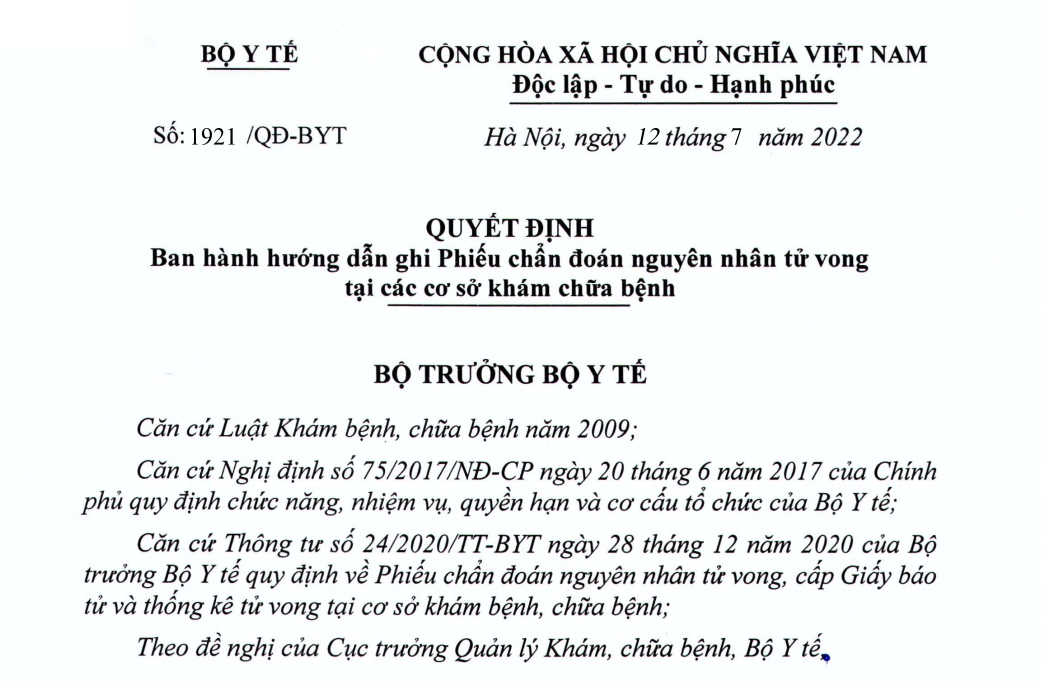 Ngày 12/7 năm 2022, Bộ Y tế ban hành Quyết định 1921/QĐ-BYT 2022 về Hướng dẫn ghi Phiếu chẩn đoán nguyên nhân tử vong tại các cơ sở khám chữa bệnh.