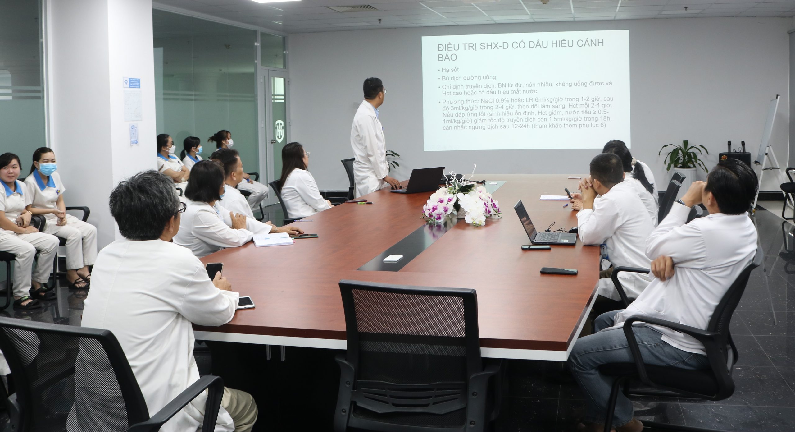 Ngày 4/7/2023, Bộ Y tế đã ban hành hướng dẫn chẩn đoán, điều trị sốt xuất huyết Dengue theo Quyết định số 2760/QĐ-BYT. Nhằm cập nhật những nội dung mới trong điều trị, chẩn đoán sốt xuất huyết Dengue cho các bác sĩ, điều dưỡng tại bệnh viện, ngày 7/6/2024 dưới sự chủ trì của BS.CKII Nguyễn Quang Minh – Giám đốc Chuyên môn bệnh viện. Bệnh viện đã tổ chức buổi sinh hoạt chuyên môn: Cập nhật phác đồ điều trị Sốt xuất huyết 2023 về sốt xuất huyết do BS. Hà Đình Hiệu ( Bác sĩ Nội khoa) báo cáo.