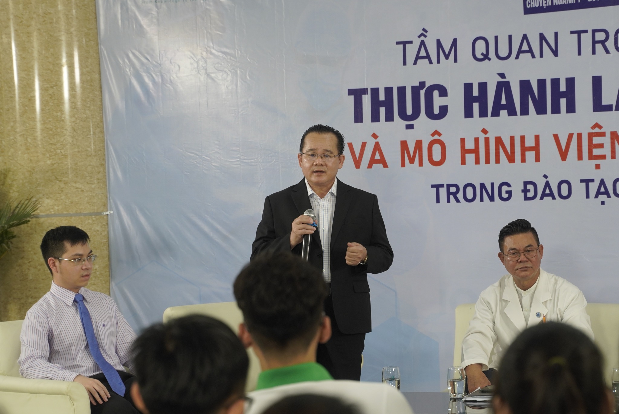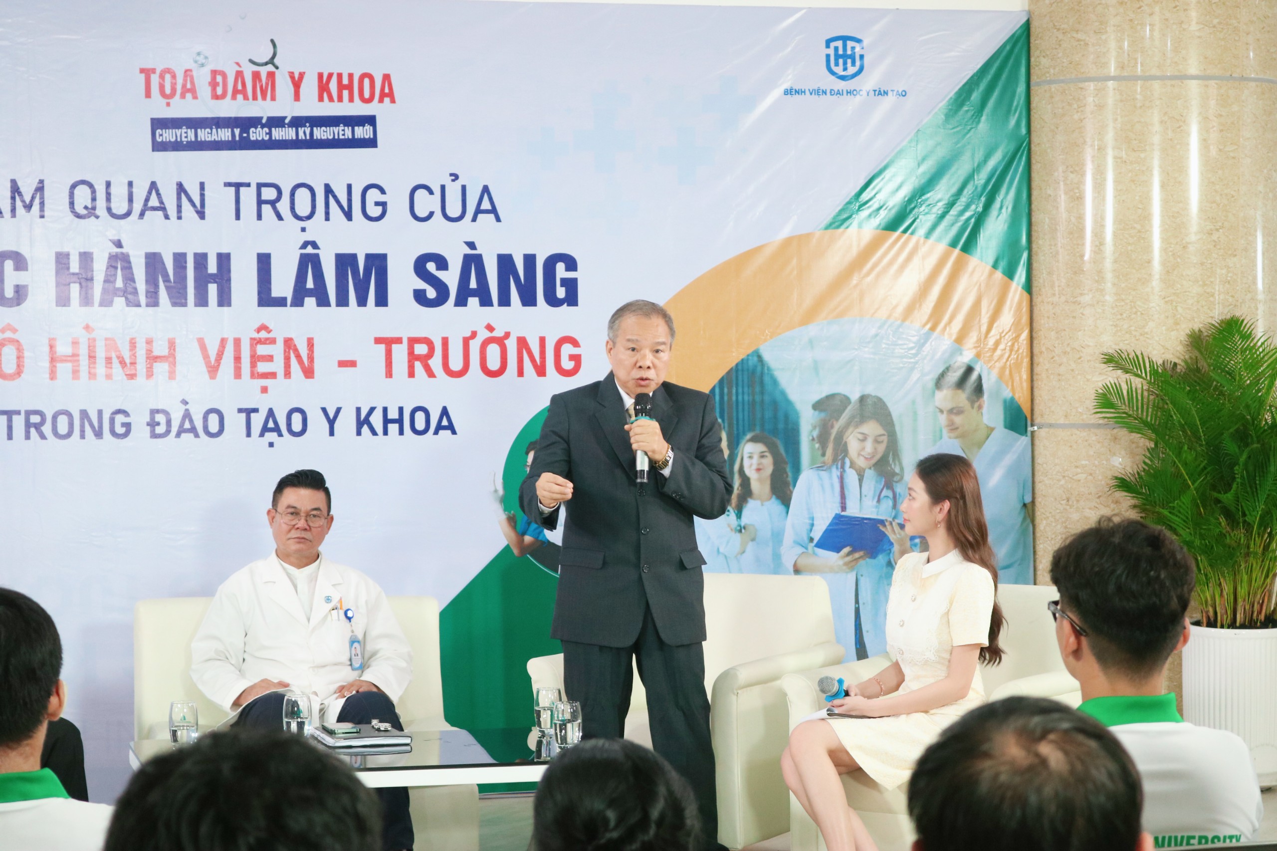 Chủ đề đầu tiên của buổi Tọa đàm là “Tầm quan trọng của thực tập lâm sàng và mô hình Viện-Trường trong đào tạo Y khoa”. Chương trình có sự tham gia của các khách mời là các bác sĩ, chuyên gia y tế.