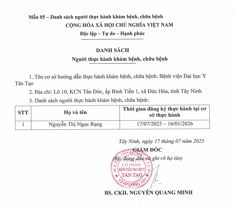 Theo Nghị định 96/2023/NĐ-CP ngày 30/12/2023 của Chính phủ quy định chi tiết một số điều của Luật Khám bệnh, chữa bệnh, Bệnh viện Đại học Y Tân Tạo công bố danh sách người thực hành khám bệnh, chữa bệnh tại bệnh viện theo danh sách đính kèm.