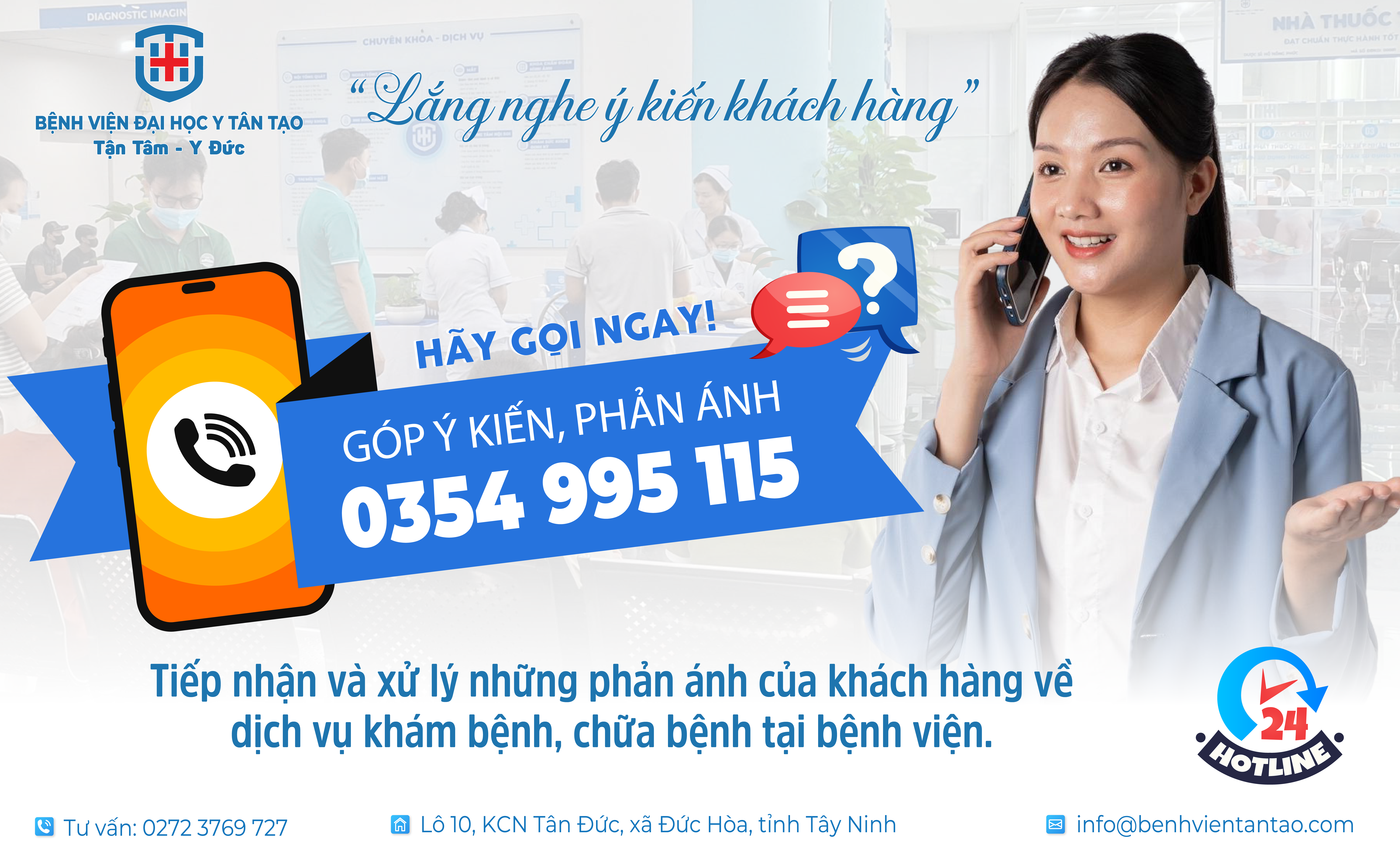 Nhằm nâng cao chất lượng toàn diện và liên tục của bệnh viện, mang lại cho khách hàng sự hài lòng cao nhất khi sử dụng dịch vụ y tế, Bệnh viện Đại học Y Tân Tạo công bố ĐƯỜNG DÂY NÓNG qua số điện thoại ☎ 0354 995 115 để tiếp nhận ý kiến và phản ánh của Quý Khách hàng và các Đối tác về chất lượng khám bệnh, điều trị bệnh và dịch vụ chăm sóc y tế.