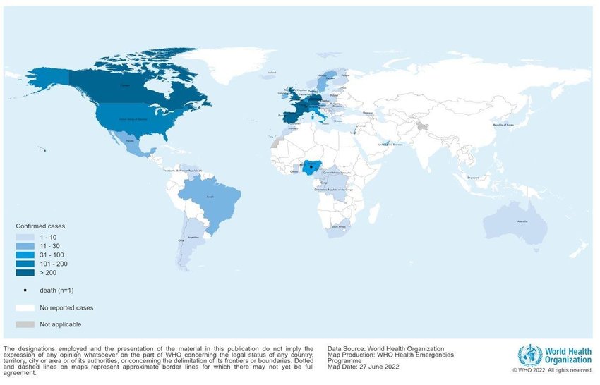 Theo báo cáo cập nhật của WHO, từ ngày 01/01/2022 đến ngày 22/7/2022, thế giới đã ghi nhận trên 16.000 trường hợp mắc bệnh đậu mùa khỉ tại 75 quốc gia ở tất cả 06 khu vực của WHO, trong đó có 5 trường hợp tử vong.