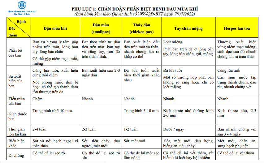 Dựa trên triệu chứng sốt, phát ban và hạch to, cần chẩn đoán phân biệt bệnh đậu mùa khỉ với các bệnh sau: Đậu mùa (smallpox), Thủy đậu (chicken pox), Herpes lan tỏa, Tay chân miệng.