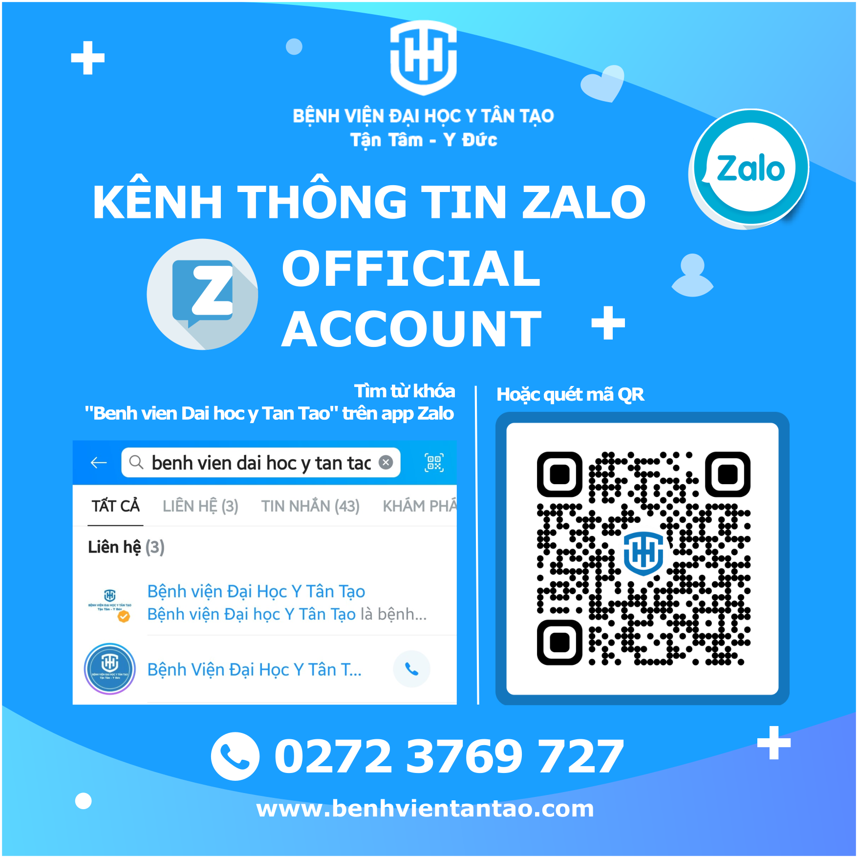 Bệnh viện Đại học Y Tân Tạo đã vận hành kênh thông tin Zalo “Bệnh viện Đại học Y Tân Tạo”, song hành với các kênh truyền thống khác như website www.benhvientantao.com, Facebook fanpage và Tổng đài 0272 3769 727.
