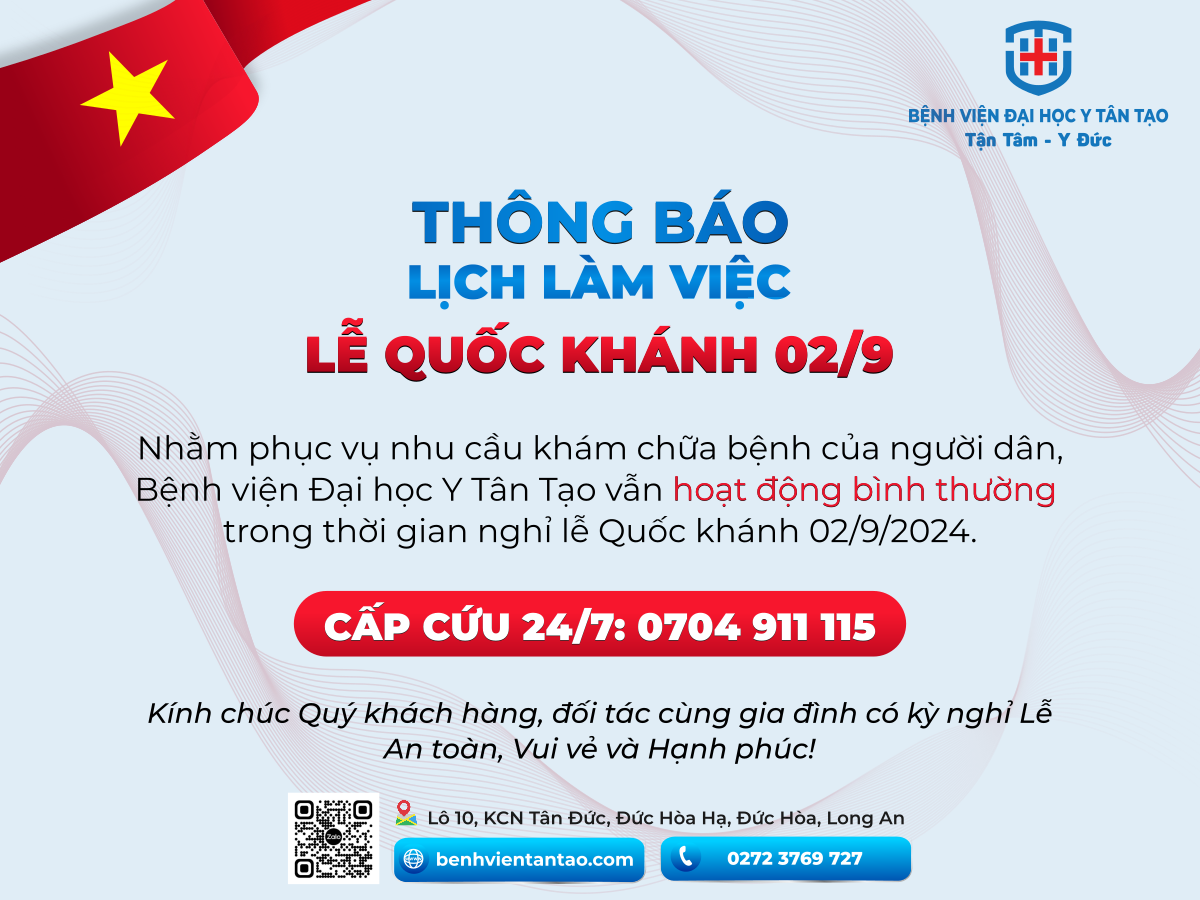 Bệnh viện Đại học Y Tân Tạo trân trọng thông báo lịch làm việc trong dịp kỷ niệm 79 năm Ngày Quốc Khánh Việt Nam (2/9/1945 – 2/9/2024) để quý khách hàng và đối tác thuận lợi trong khám chữa bệnh và liên hệ công việc.