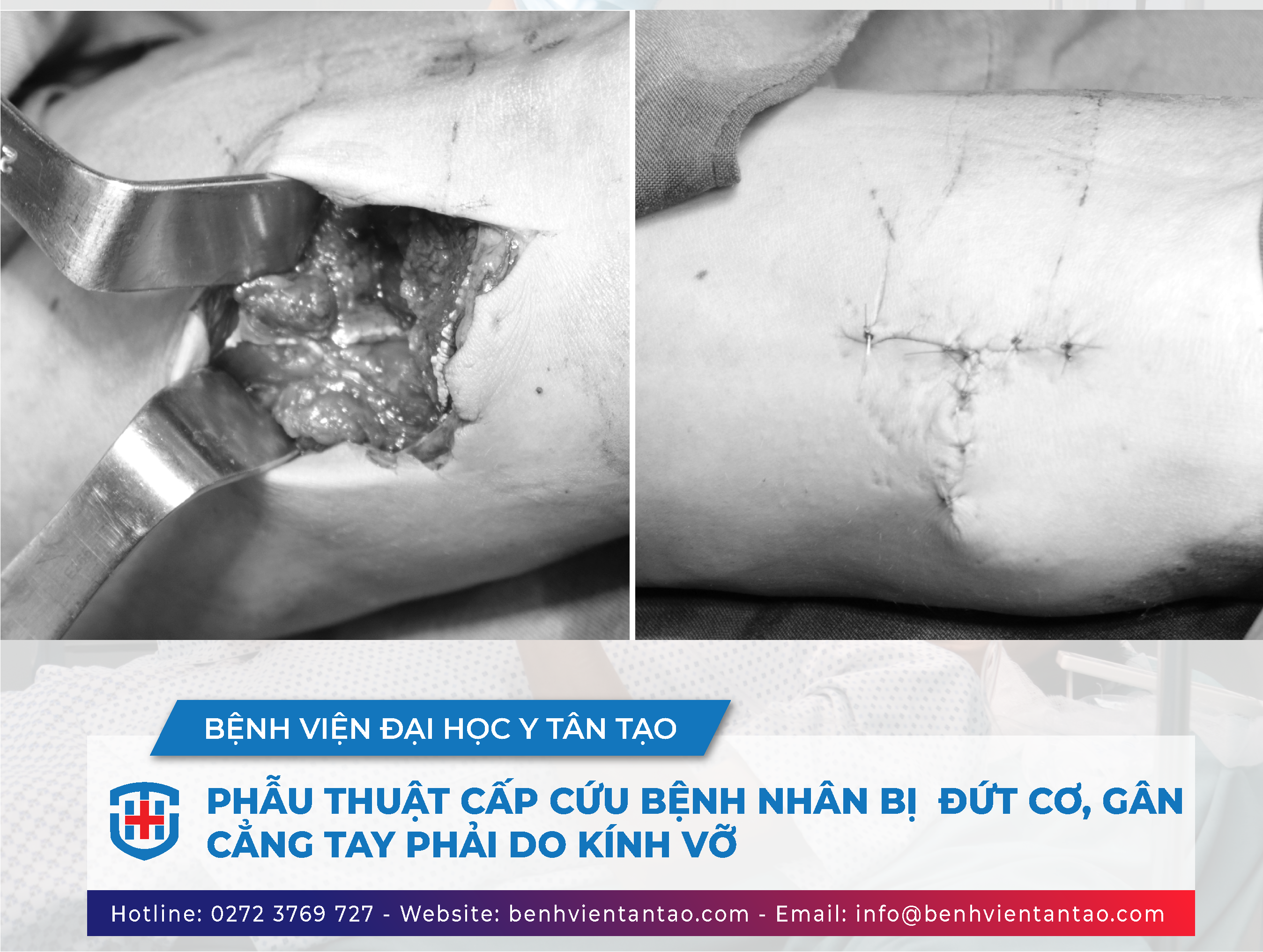 Ca phẩu thuật khâu nối gân, cơ được hoàn thành sau 15 phút bởi BS.CKI Nguyễn Tuấn Khanh. Vết thương đứt cơ được nhanh chóng xử lý đúng cách, điều trị và khâu nối kịp thời đảm bảo thời gian phục hồi nhanh và bảo vệ chức năng cơ tay của bệnh nhân.