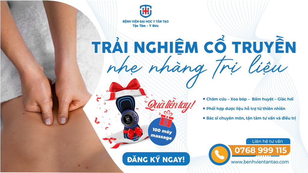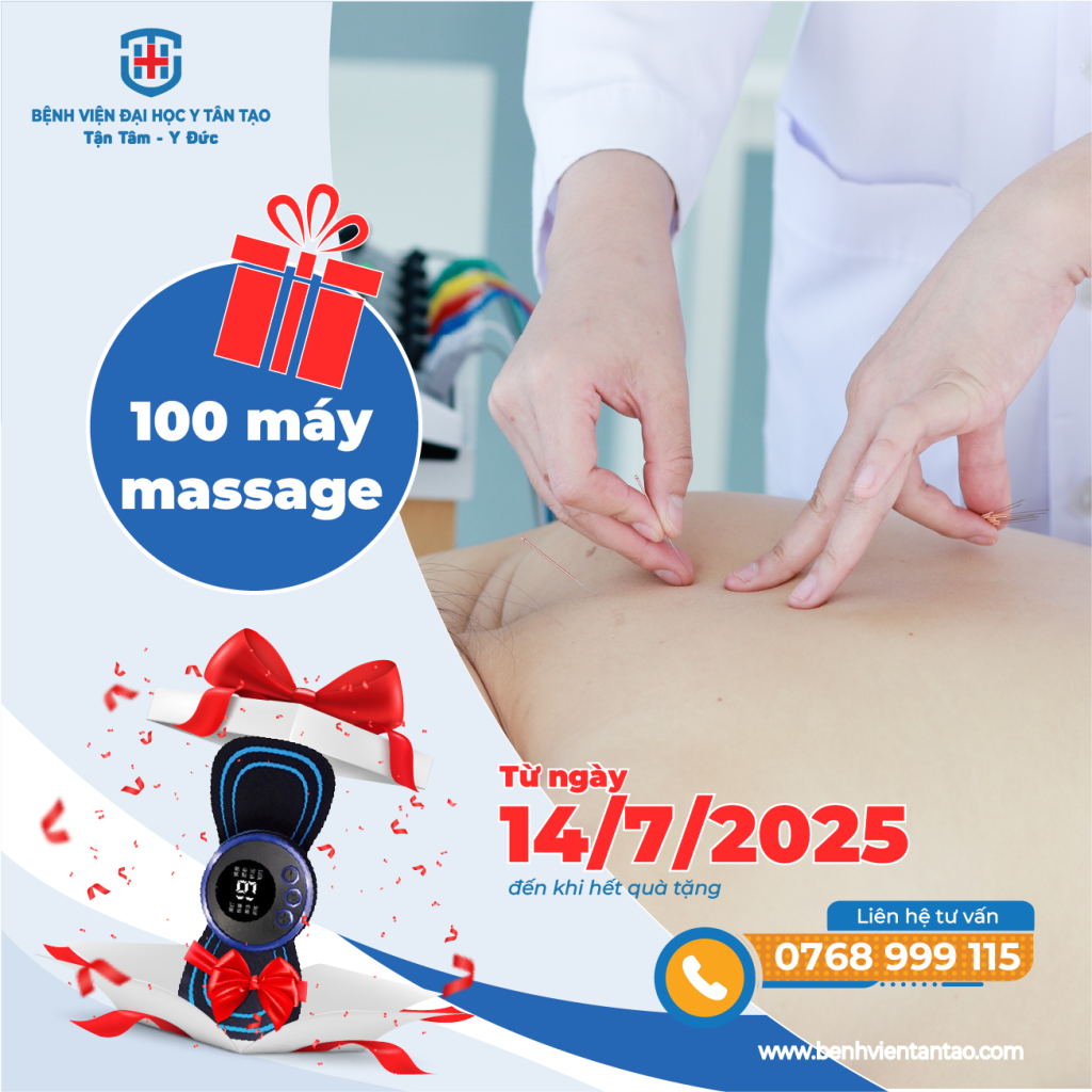 Từ 14/7/2025, quý khách có trải nghiệm khám và điều trị lần đầu tại Bệnh viện Đại học Y Tân Tạo có cơ hội nhận ngay quà tặng ý nghĩa “Máy mát-xa xung điện” hỗ trợ cho điều trị và chăm sóc sức khỏe mỗi ngày.