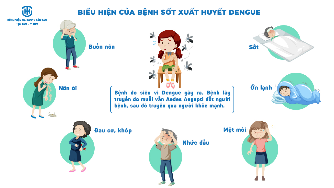 Sốt xuất huyết Dengue: sốt cao đột ngột, liên tục từ 2-7 ngày, có ít nhất 2 trong các dấu hiệu: