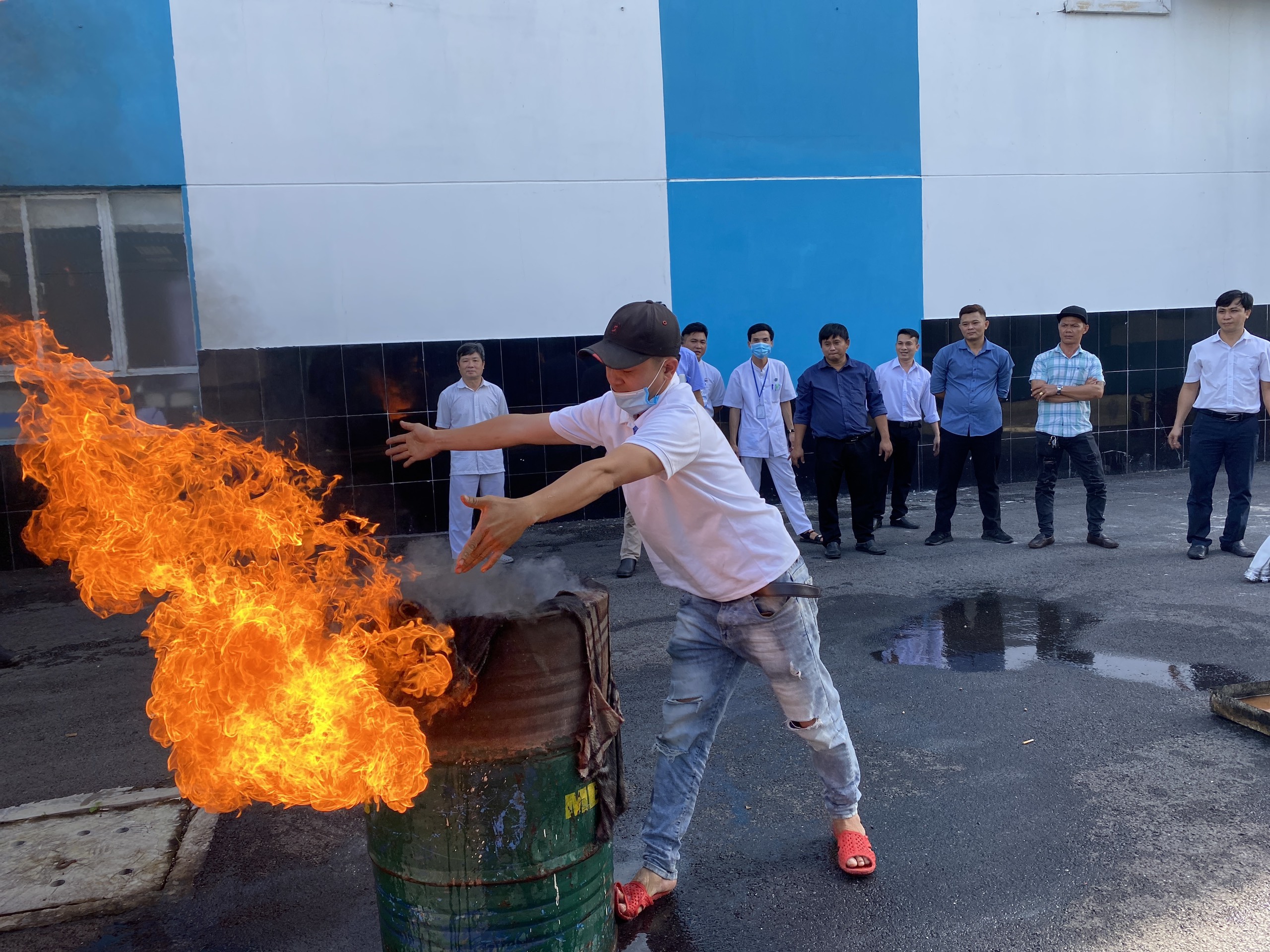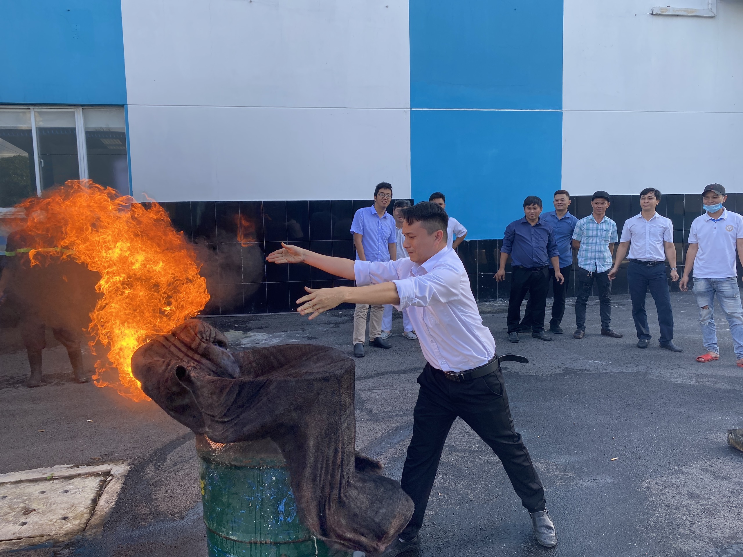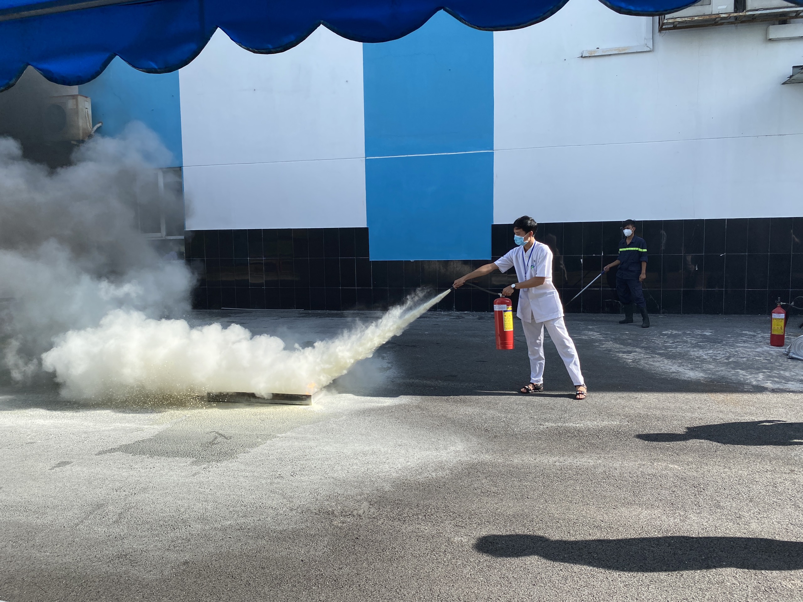 Sau giờ lý thuyết, học viên được được thực hành cách sử dụng các phương tiện bình bột, bình khí CO2 để dập tắt đám cháy và cách xử lý nhanh tình huống có thế xảy ra, 100% học viên đã sử dụng thành thạo các phương tiện chữa cháy.