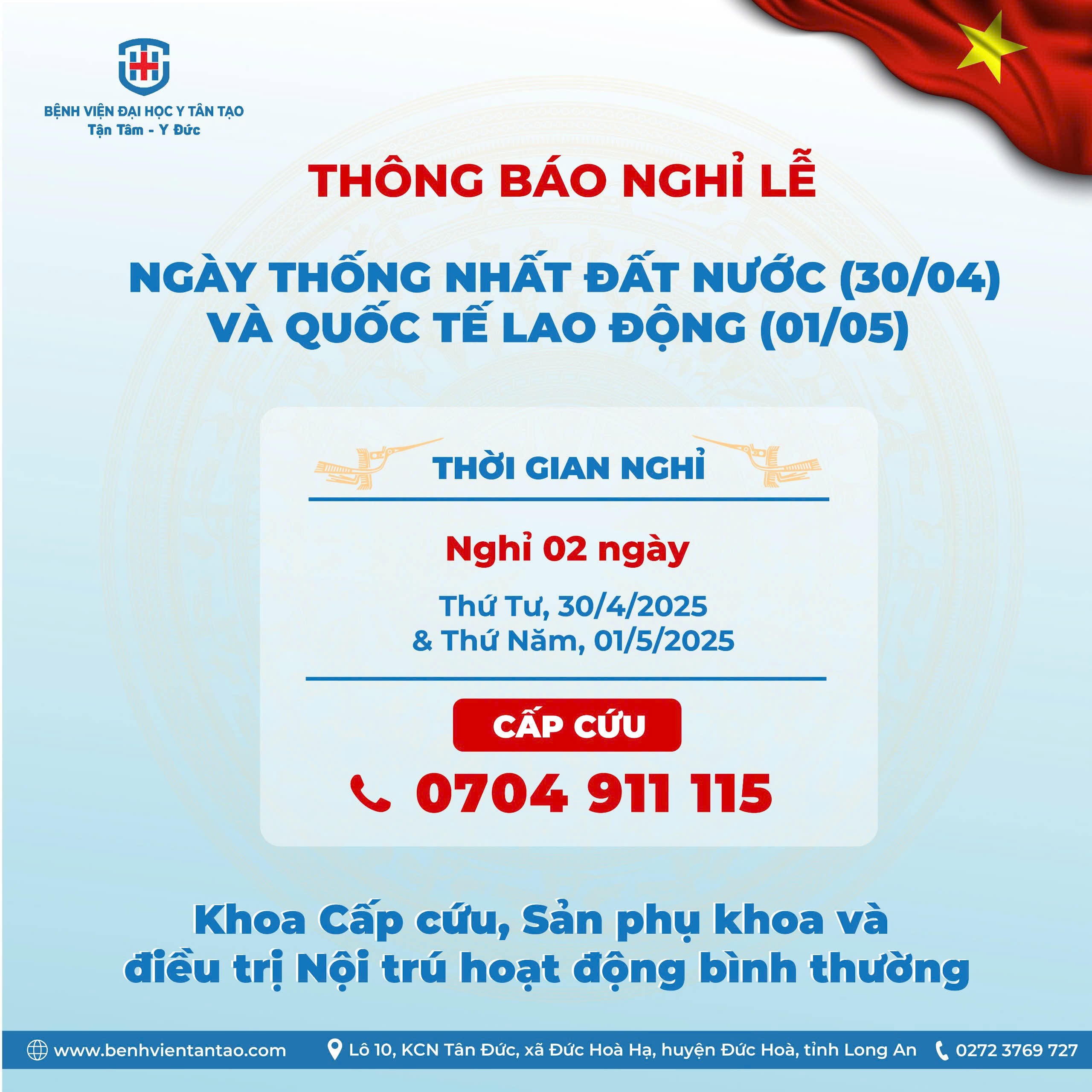 🎈 Trong thời gian nghỉ lễ, hoạt động Cấp cứu, Khoa Sản phụ và Điều trị Nội trú đảm bảo phục vụ 24/7.