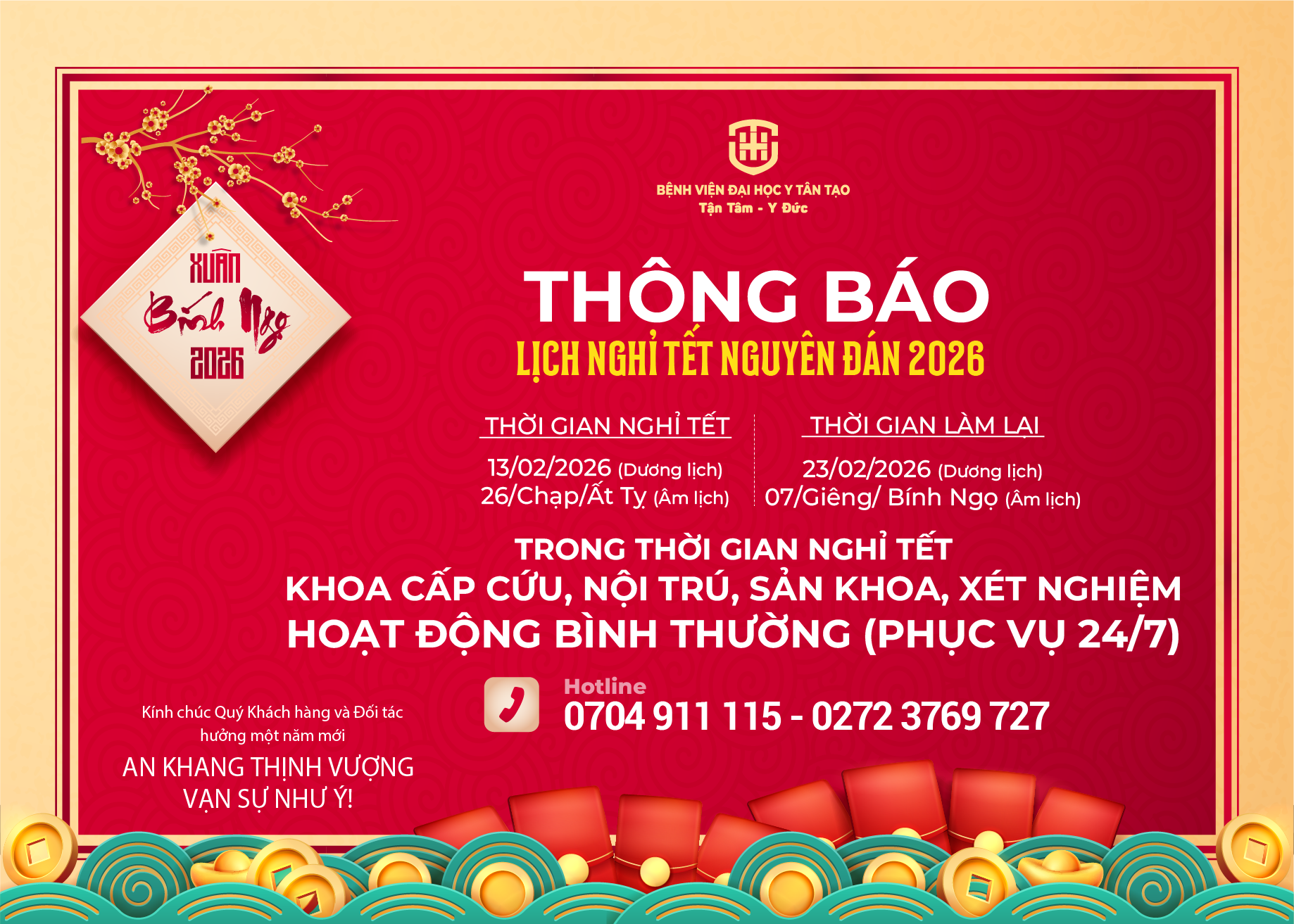 Nhằm thuận lợi cho Quý Khách hàng, Quý Bệnh nhân, thân nhân và các Đối tác liên hệ khám chữa bệnh và công việc, Bệnh viện Đại học Y Tân Tạo thông báo lịch nghỉ Tết Nguyên đán năm Bính Ngọ (2026).