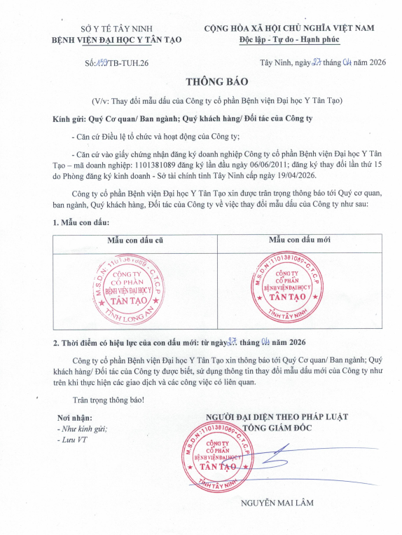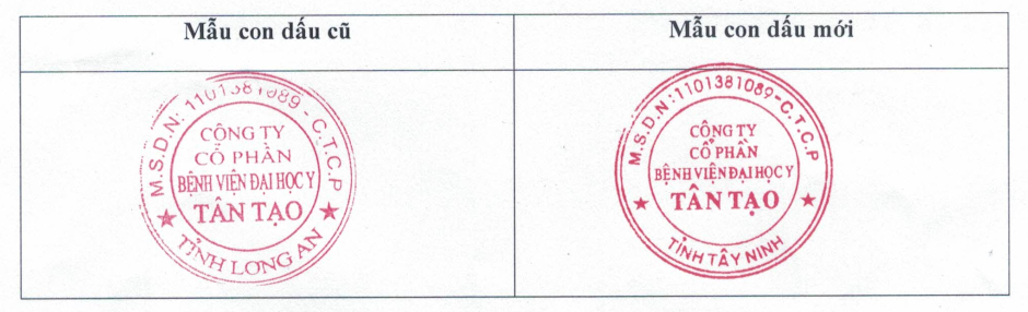 Công ty Cổ phần Bệnh viện Đại học Y Tân Tạo thông báo đến Quý Cơ quan, Ban ngành; Quý Khách hành và Đối tác của Công ty được biết, sử dụng thông tin thay đổi mẫu dấu như trên khi thực hiện các giao dịch và các công việc có liên quan.