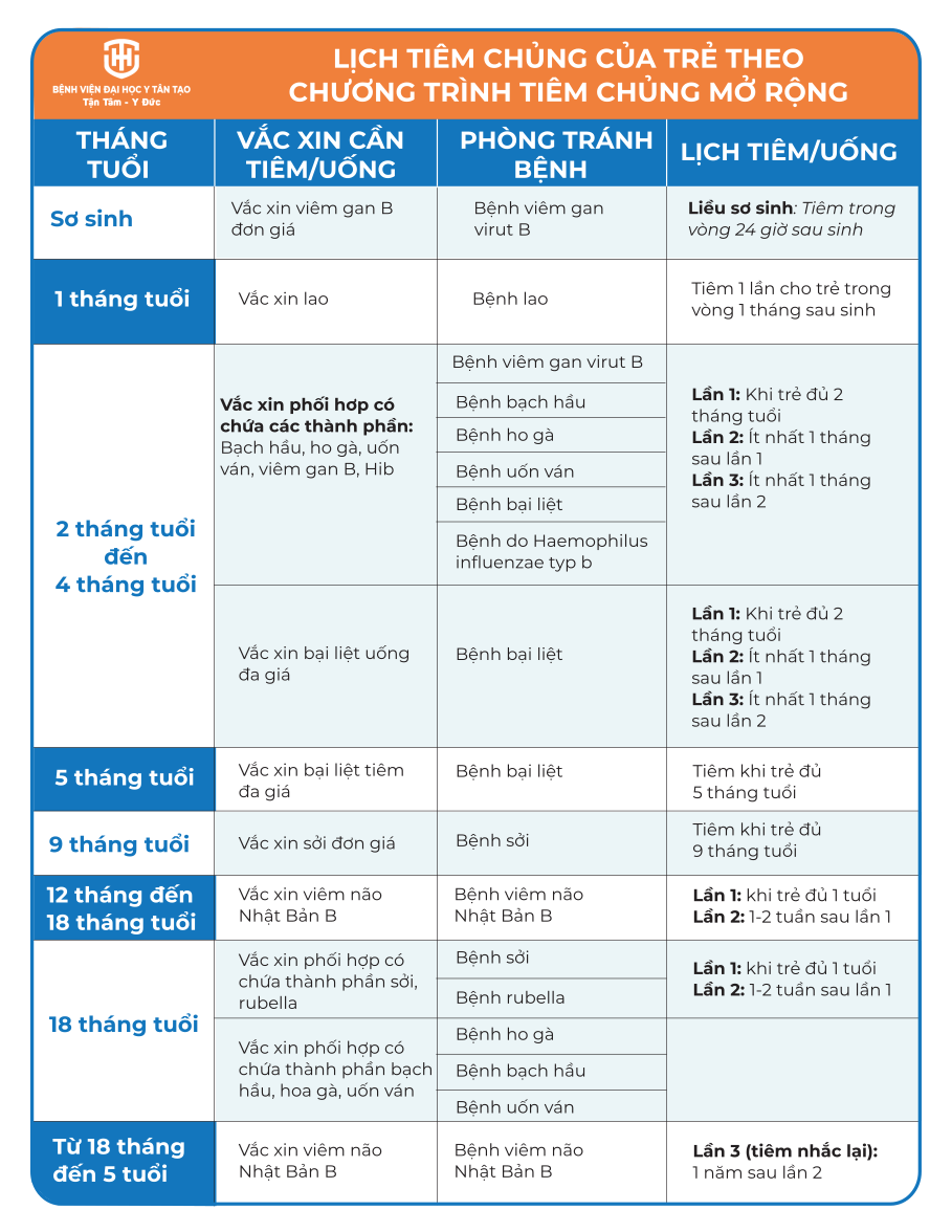 Trẻ được tiêm chủng đầy đủ, đúng lịch theo Chương trình Tiêm chủng mở rộng sẽ giúp bảo vệ trẻ khỏi các bệnh truyền nhiễm nguy hiểm, bao gồm: lao, bạch hầu, ho gà, uốn ván, bại liệt, sởi, rubella (sởi Đức), viêm gan B, nhiễm khuẩn Hib (gây viêm màng não mủ, viêm họng, viêm phế quản phổi,…), viêm não Nhật Bản.