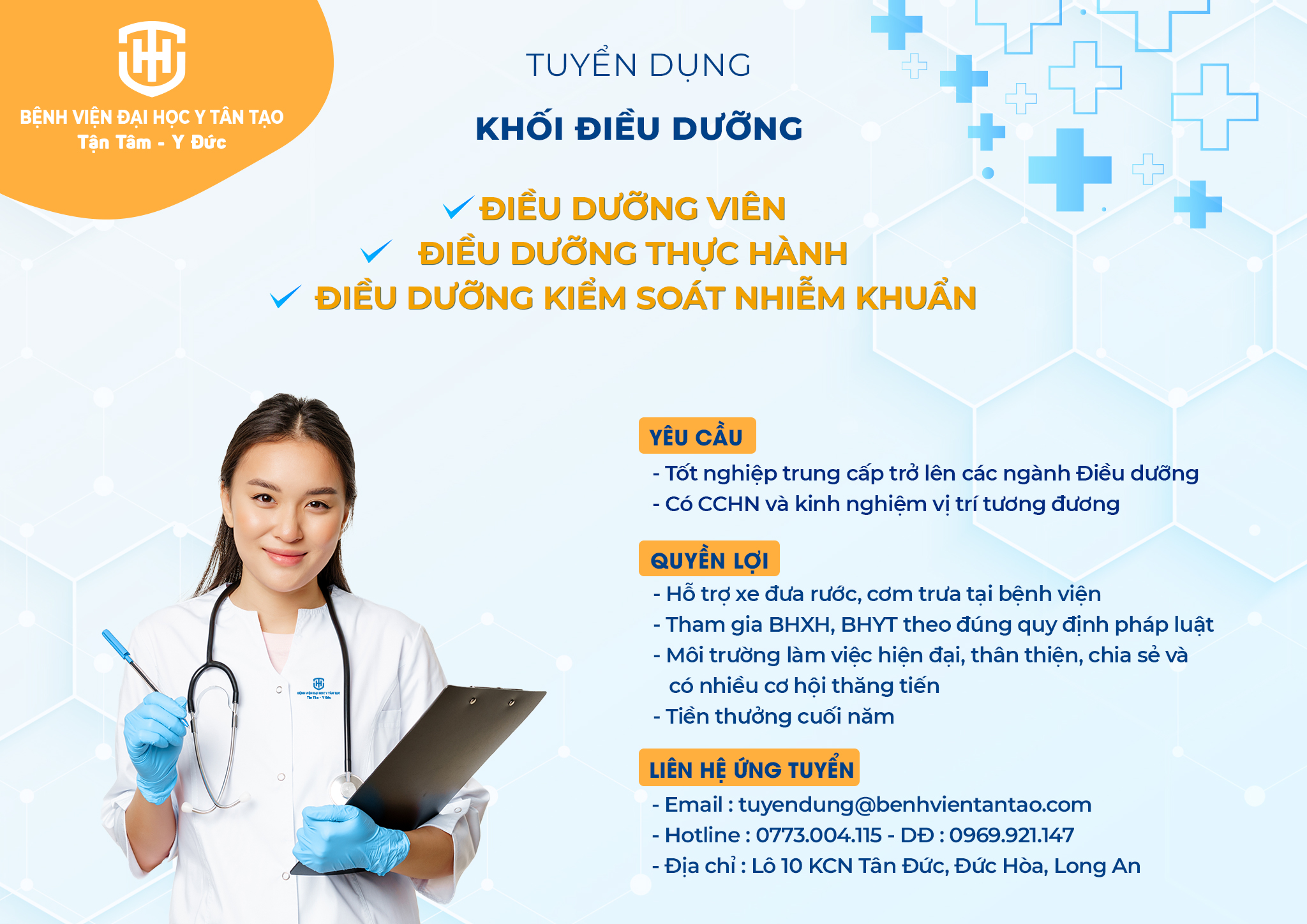 Do nhu cầu mở rộng hoạt động và thực hiện công tác chăm sóc sức khỏe bệnh nhân, Bệnh viện Đại học Y Tân Tạo cần tuyển các vị trí